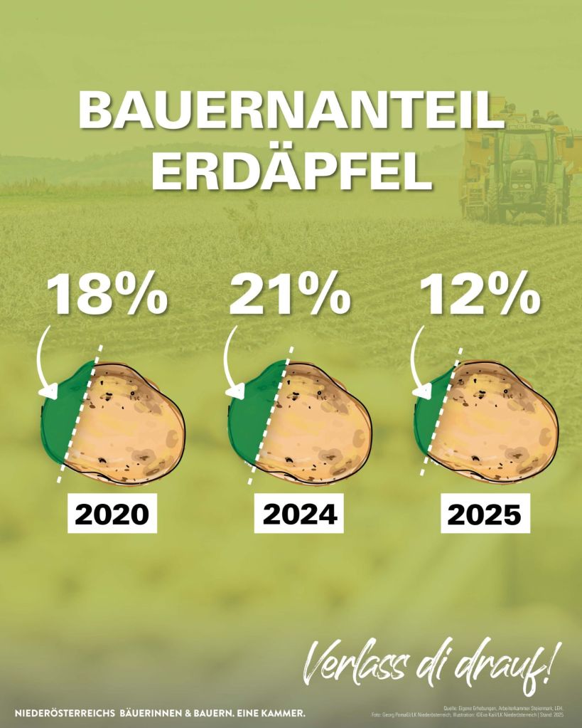 Wunderschöne Grafik, einfach und auf den Punkt. Allerdings fehlt der entscheidende Dreh um 90 Grad. Und schon wird die Entwicklung des Bauern-Anteils sichtbar, weil die Oberkanten des Erdäpfel-Diagramms schön ausgerichtet und damit gut vergleichbar sind. Verlass di drauf!