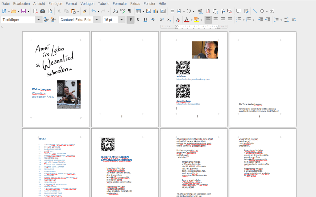 Alle Wienerlied-Texte aus eigenem Anbau in einem Band und das ist noch nicht alles: Wer möchte, kann sich jedes Lied auch gleich mittels QR-Code anhören. Und zwar nicht nur als Hörprobe sondern in voller Länge und bestmöglicher Qualität. Bis zum Auftritt am 11. Juni im Genuss-Spiegel in Wien-Atzgersdorf sollte das Werk vollbracht sein. Wird noch ein bissl Arbeit – immerhin gute zwei Dutzend Lieder sinds am End…