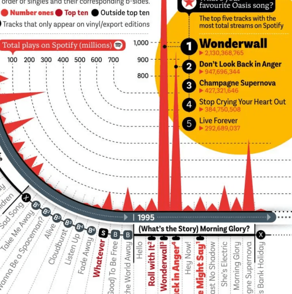 Pünktlich zum Start der Oasis-Mega-Comeback Tour: Delayed Gratification steuert wiedermal eine spannende und inspirierende Infografik bei, in ihrer Paradedisziplin Timelines. Die Überhits der Britpop Superstars knallen sofort ins Auge, heruntergebrochen auf Spotify-Plays, ebenso die übrigen – weniger erfolgreichen Alben in chronologischer Reihenfolge. Well done, thanks! https://www.slow-journalism.com/infographics/oasis-infographic?mc_cid=9d7f398d1a&mc_eid=d1d76f2a57Alben