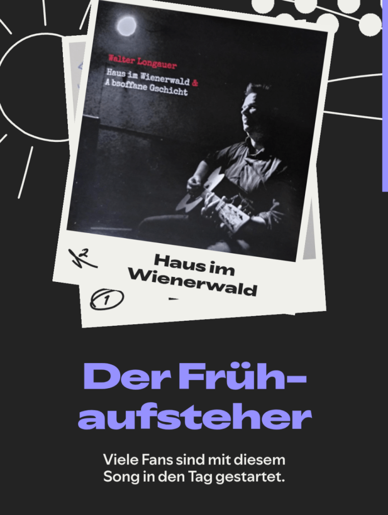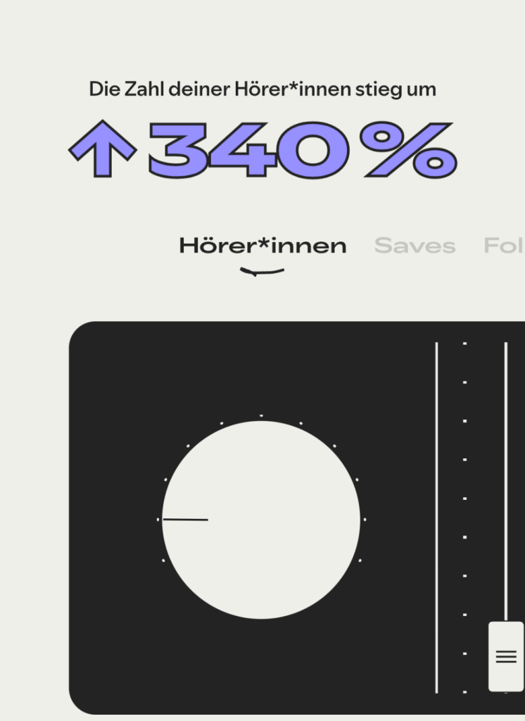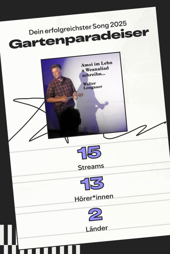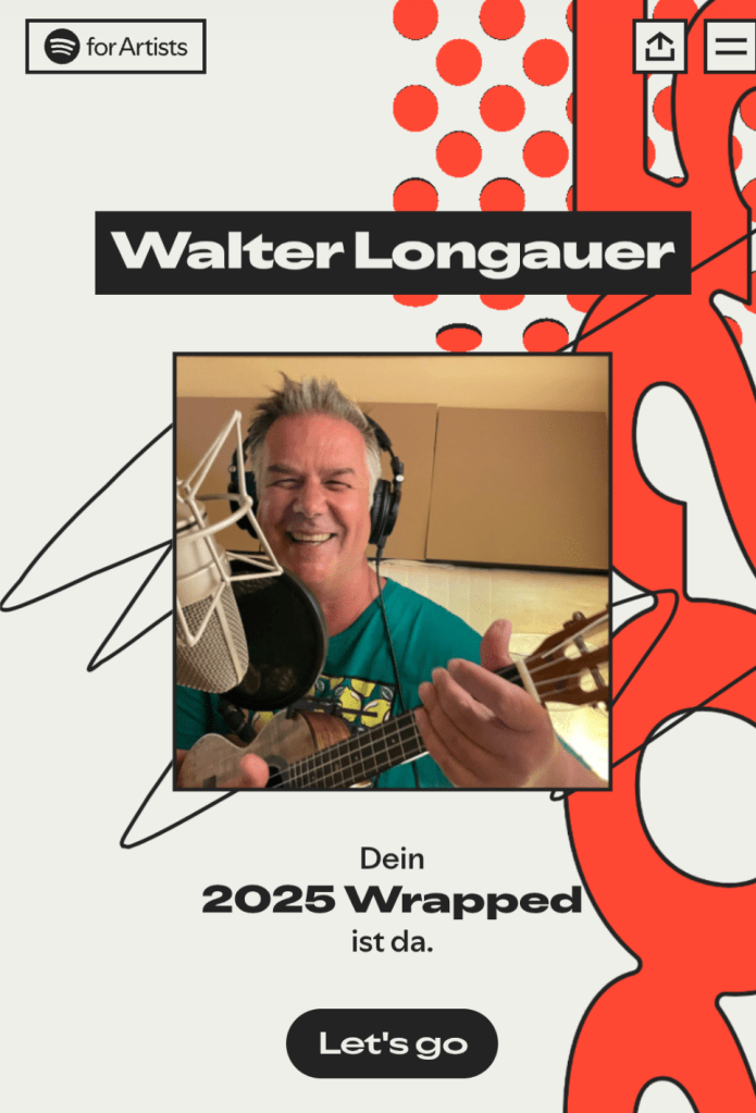 Gnadenloser Selbstversuch: Wie meine bescheidenen Streamingdaten auf Spotify im traditionellen Rückblick „wie die Großen“ dargestellt werden. Schon witzig, wenn sensationelle Zuwachsraten von 340% gefeiert werden, bei einer Gesamtzahl von ganzen 44 Hörer*innen 🙂 Es wird eine abwechslungsreiche Story erzählt mit Fun Facts wie „Der Frühaufsteher“, also Songs die gerne morgens angehört werden, bei wie vielen Hörer*innen ich unter den Top Ten Artists bin (5), wie oft ich es in Playlists geschafft habe (2x) und natürlich – wow! – mein Top-Album mit satten 15 Streams. Ich frage mich, wo hier die Angabe „Millionen“ abgeblieben ist. Also sehr kreativ, auch mit fancy Designs, leider nur sehr sparsam mit Charts durchwirkt. Da wäre etwas mehr schon anschaulicher gewesen und mehr Absolutzahlen hätten die traurige Wirklichkeit besser gezeigt. Aus der Traum vom Superstar. Aber kommt natürlich durch die Automatisierung sehr motivierend rüber von wegen „du machst das großartig“. Wie müssen sich wohl echte Acts dabei fühlen? Oder sehen die das anders?