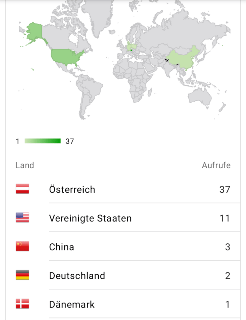 Auf den ersten Blick hatte meine Website im April in den USA die meisten Fans, die Tabelle zeigt ein komplett anderes – realistischeres Bild. Mehr als dreimal soviele Zugriffe als in den Staaten. Und zehnmal mehr als China, das auf der Weltkarte auch sehr prominent leuchtet. Das kleine Österreich ist kaum auszumachen, da kann die Farbe noch so satt sein. Ein wunderbares Beispiel, welche Stories mit eingefärbten Karten nicht erzählt werden können. Ein simples Barchart (mit Flaggen angereichert) wäre die bessere Wahl, wo China und die USA liegen und wie groß sie sind, ist hier wohl nicht der Punkt…